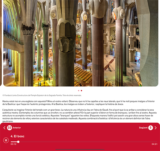 Baixa’t al teu dispositiu l’audioguia i no et perdis cap detall de la Basílica! Disponible en 19 idiomes: català (CA), castellà (ES), Euskera (EU), Gallec (GL), anglès (EN), francès (FR), alemany (DE), italià (IT), xinès (ZH), japonès (JA), portuguès (PT), rus (RU), hongarès (HU), coreà (KO), suec (SV), finès (FI), polonès (PL), neerlandès (NL), ucraïnès (UK) i romanès (RO). També hi ha disponible la signoguia en llengua de signes espanyola (LSE), llengua de signes catalana (LSC) i sistema de signes internacional (SSI), així com l’audioguia descriptiva en 3 idiomes: català, castellà i anglès.