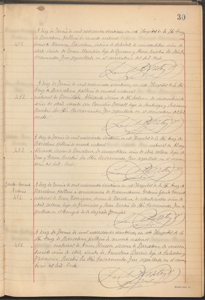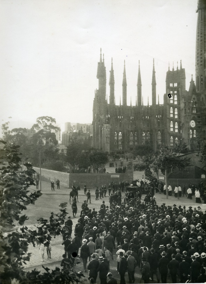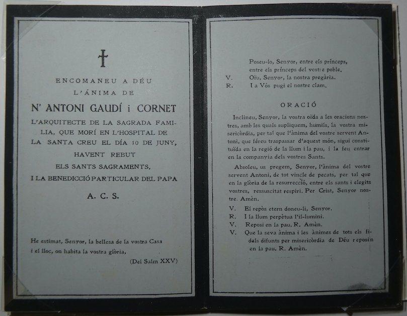 Gaudí died on 10 June 1926 at Hospital de la Santa Creu in Barcelona, three days after being run over by a tram on his way to the Sant Felip Neri chapel of prayer. On 12 June, a great crowd joined his funeral procession towards the Temple of the Sagrada Família.