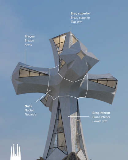 Los brazos siguen la geometría de doble giro que Gaudí dio a las columnas y a las cruces de la Sagrada Familia. Presentan una forma cuadrada en el extremo exterior y octagonal en el extremo interior, que conecta con el núcleo. Cada pieza tiene un peso aproximado de 12,80 toneladas y una longitud de 4,40 m x 4,50 m x 4,50 m.