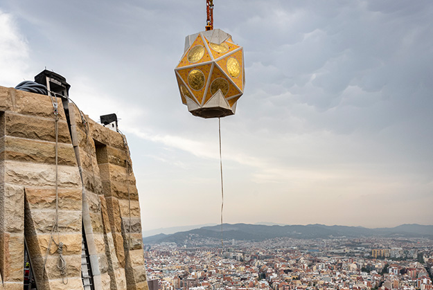 El 24 de julio se ha colocado el icosaedro de la torre de Mateo. De este elemento, una vez finalizada la torre, surgirá la figura del tetramorfo, en este caso la figura humana con el libro y las alas.